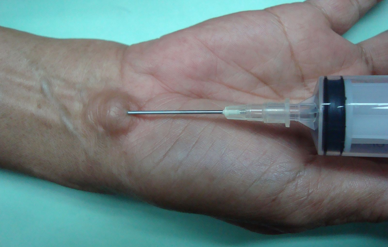 - Αναρρόφηση. Αν το γάγγλιο προκαλεί πολύ πόνο ή περιορίζει σημαντικά τις δραστηριότητες, το υγρό μπορεί να αποστραγγιστεί από αυτό. Αυτή η διαδικασία ονομάζεται αναρρόφηση. Η περιοχή γύρω από την γαγγλιακή κύστη αναισθητοποιείται και με μια βελόνα αναρροφάται το υγρό. Η αναρρόφηση συχνά αποτυγχάνει να εξαλείψει το γάγγλιο, επειδή η "ρίζα" ή η σύνδεση με την άρθρωση ή το έλυτρο δεν αφαιρείται.