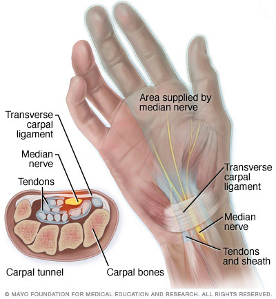Το σύνδρομο καρπιαίου σωλήνα εμφανίζεται όταν οι ιστοί που περιβάλλουν τους τένοντες των καμπτήρων του καρπού διογκώνονται και ασκούν πίεση στο μέσο νεύρο. Πολλά πράγματα συνεισφέρουν στην ανάπτυξη του συνδρόμου του καρπιαίου σωλήνα: