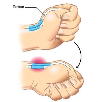Δύο από τους τένοντες του αντίχειρα (ο Μακρός Εκτείνον και ο Βραχύς Απαγωγός) διέρχονται μέσα από ένα τούνελ στο πλάι του καρπού. Οι τένοντες καλύπτονται από ένα λεπτό στρώμα ολισθηρό μαλακού ιστού. Αυτό το στρώμα επιτρέπει στους τένοντες να γλιστράνε εύκολα μέσα σε μία ινώδη σύραγγα που ονομάζεται τενόντιο έλυτρο.Κάθε διόγκωση των τενόντων ή / και πάχυνση του ελύτρου , οδηγεί σε αυξημένη τριβή και τον πόνο με ορισμένες κινήσεις.