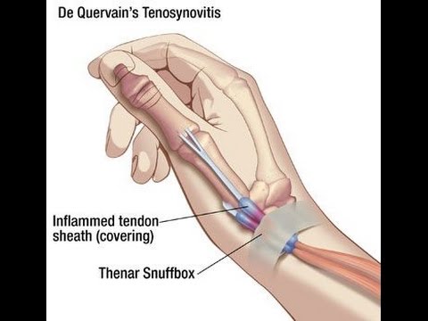 Πρόκειται για μία φλεγμονή των τενόντων και του ελύτρου του πρώτου εκτατικού διαμερίσματος του χεριού. Το βασικό σύμπτωμα είναι ο πόνος και η ευαισθησία κατά μήκος του αντίχειρα και της πηχεοκαρπικής άρθρωσης. Αυτό είναι ιδιαίτερα έντονο όταν σχηματίζετε μια γροθιά , πιάνοντας κάτι ή όταν περιστρέφετε τον καρπό. Μπορεί να εμφανιστεί επίσης οίδημα στην περιοχή και πιο σπάνια κριγμός κατά την κίνηση.