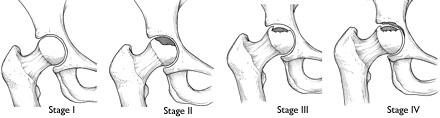 Η οστεονέκρωση αναπτύσσεται σε στάδια. Ο πόνος στο ισχίο είναι το τυπικότερο σύμπτωμα. Αρχικά πρόκειται για ένα διαλείποντα μηχανικό πόνο ο οποίος σταδιακά επιδεινώνεται με αποτέλεσμα να κάνει αδύνατη τη στήριξη στο πάσχον ισχίο.