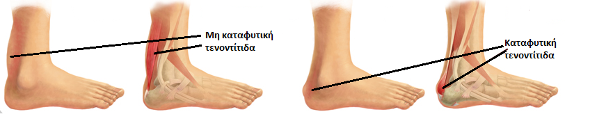 2)Καταφυτική τενοντίτιδα κατά την οποία το πρόβλημα εστιάζεται στην κατάφυση του τένοντα στο σημείο δηλαδή που ο τένοντας ενώνεται με την πτέρνα